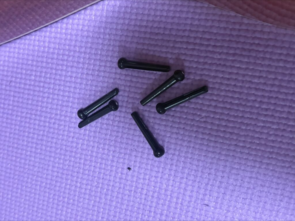 この時に、ブリッジピンの切れ込みが入っているところに弦を差し込んで、上向きにしておきます。