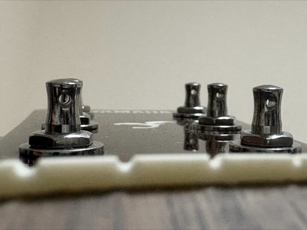 上の写真のように、ペグの穴の向きをネック側にそろえることで巻き付けやすくなります。